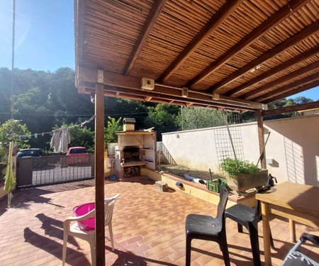 La resede esterna è valorizzata dalla presenza di un barbecue in muratura e di due costruzioni in legno ad uso magazzino/deposito, ideali come spazi di servizio o per lo stoccaggio di attrezzature.