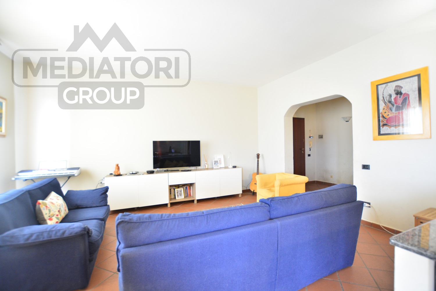 La zona giorno ha la sala separata da un arco dalla cucina abitabile ed è molto luminosa grazie alla presenza di una finestra e di una portafinestra che ci fa accedere su un terrazzo esclusivo.