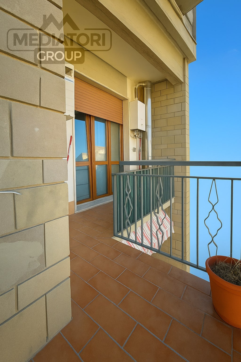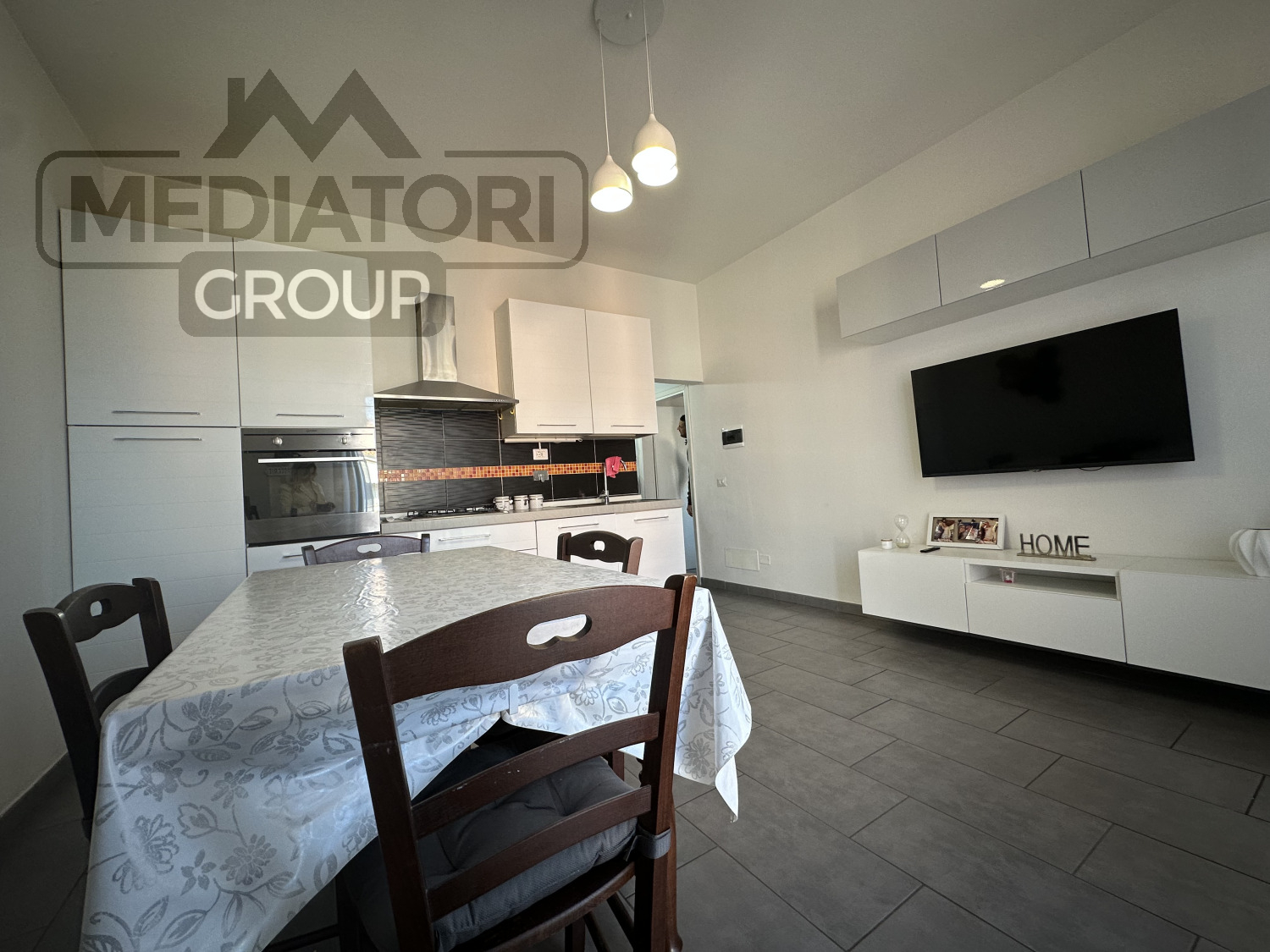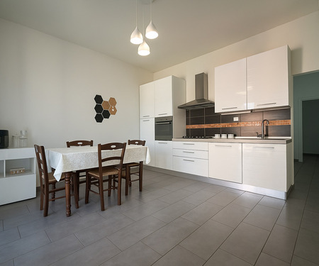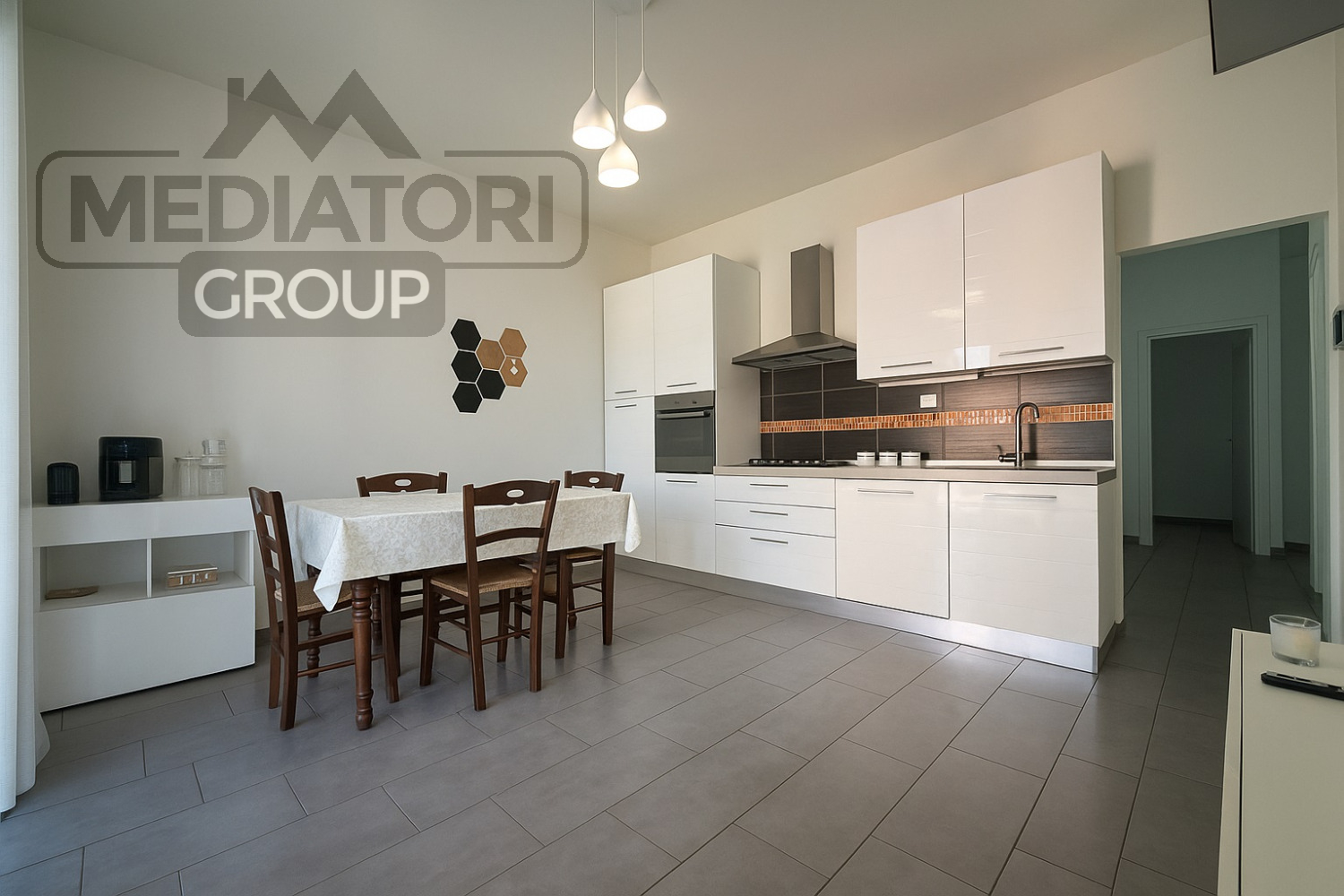 La cucina abitabile e la camera matrimoniale condividono l’accesso a un ampio terrazzo, che collega i due ambienti e offre uno spazio esterno ideale per momenti di relax.