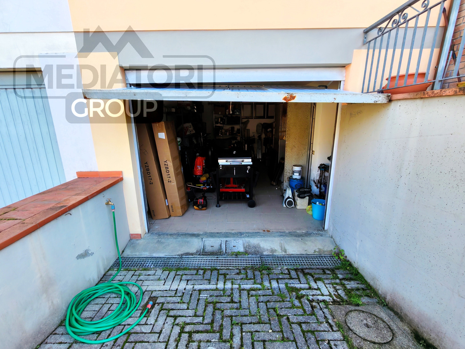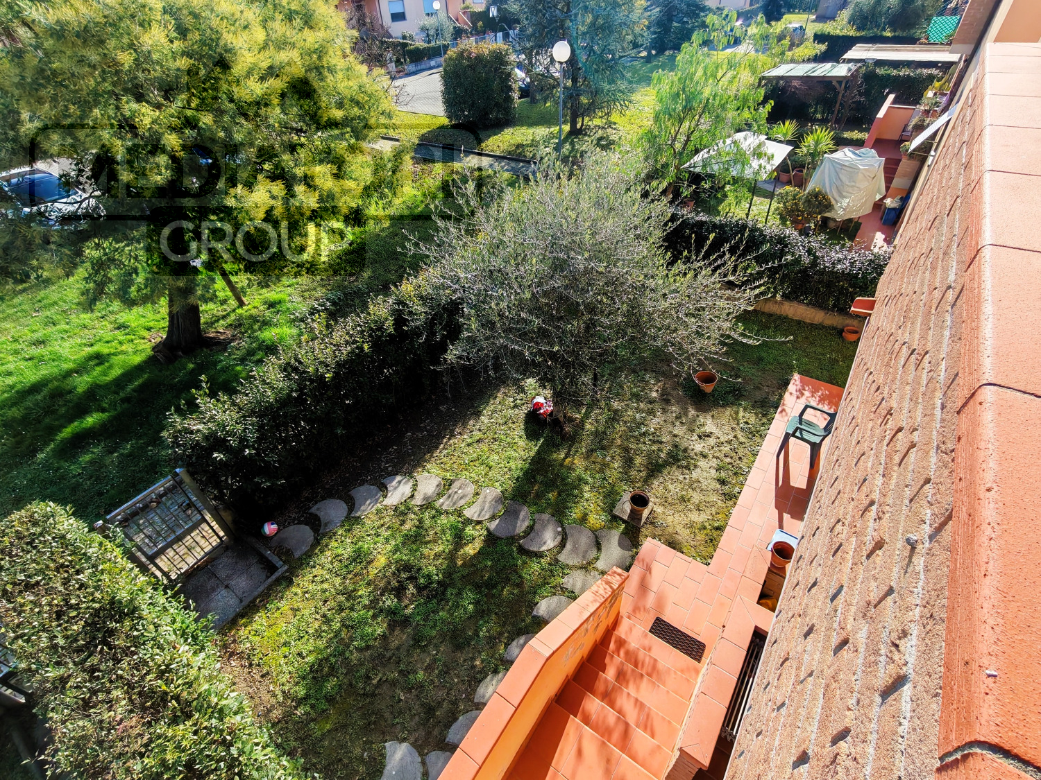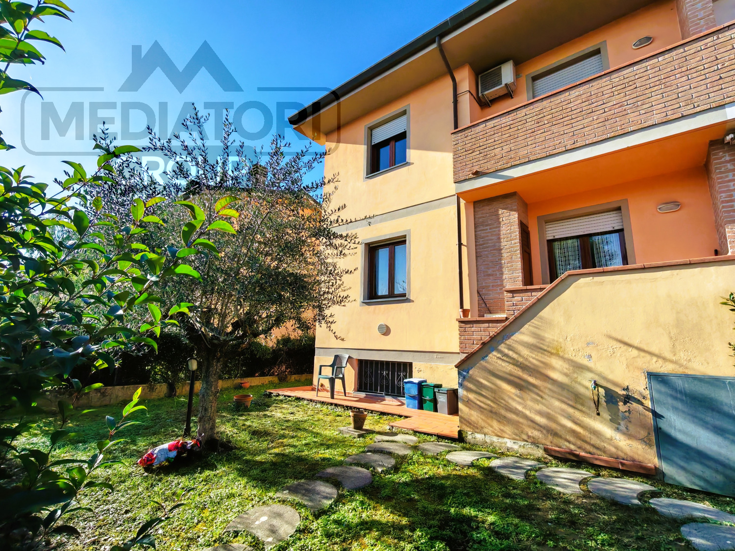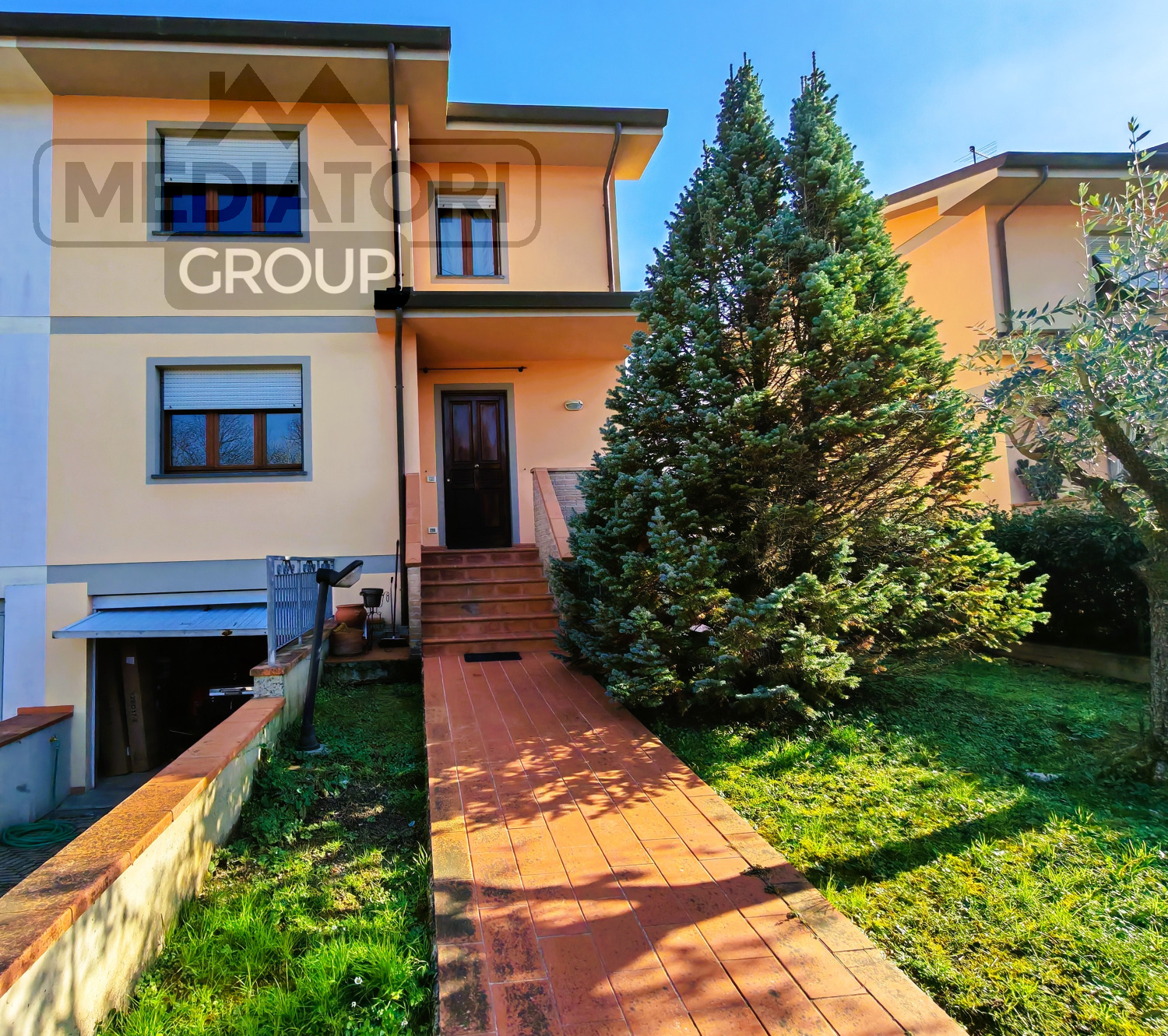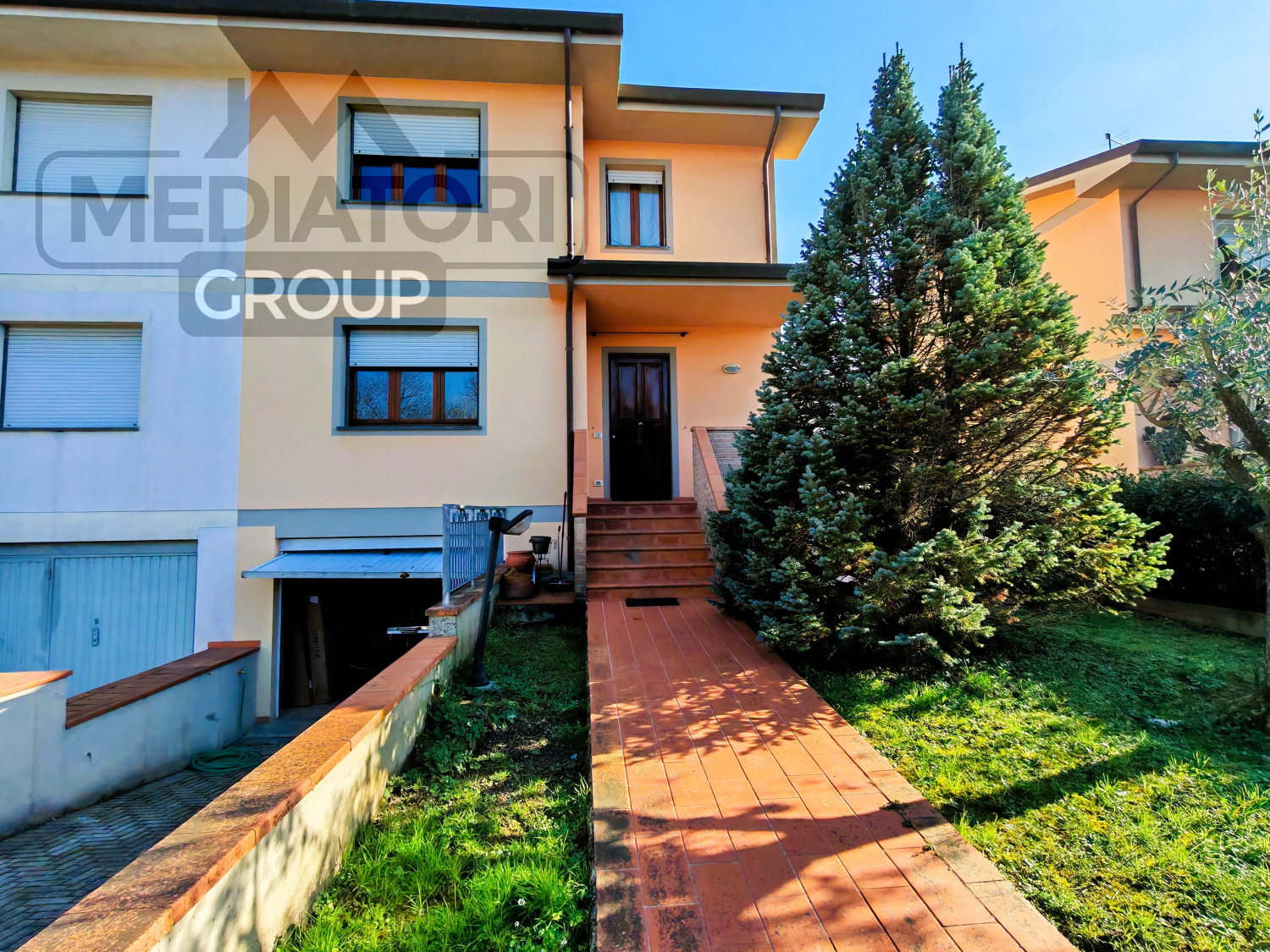 La proprietà è completata da giardino privato su tre lati e resede privata con discesa che si collega al garage, resede condominiale ben mantenuta e posto auto nell’area di parcheggio condominiale.