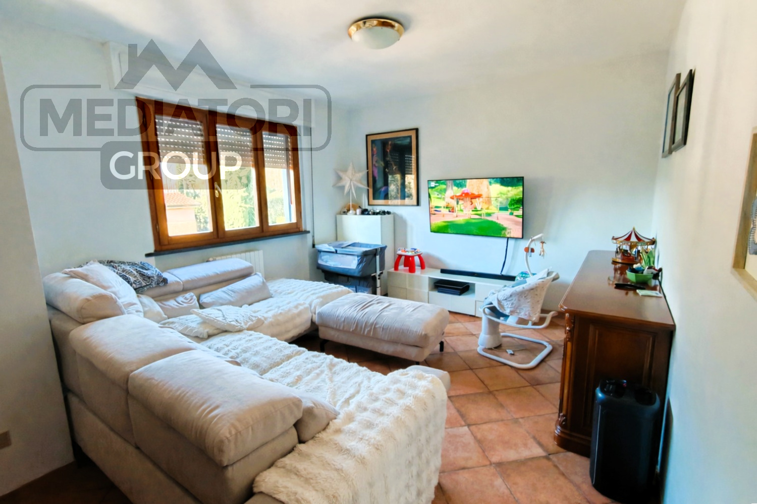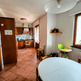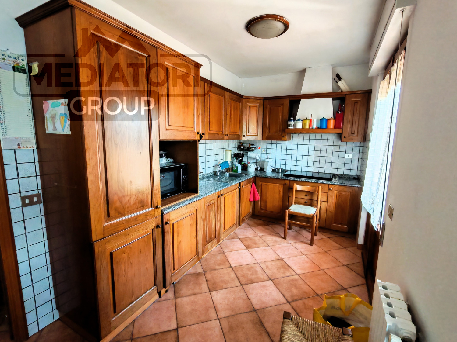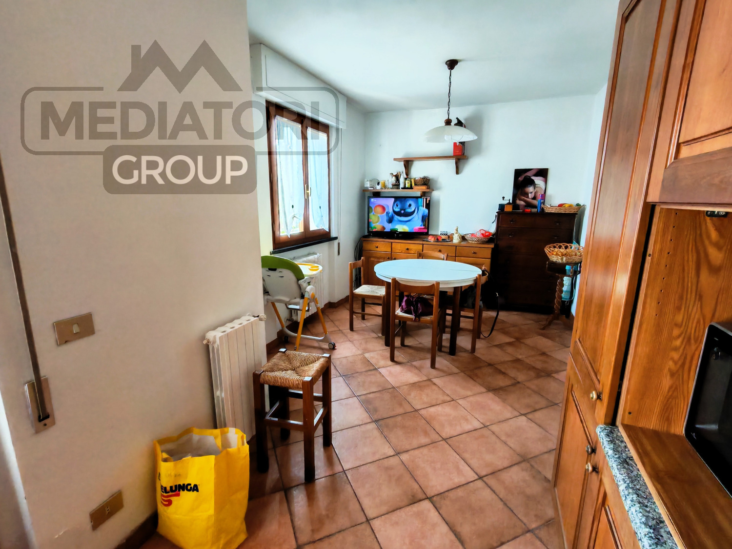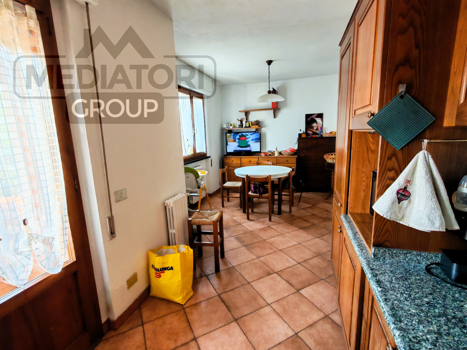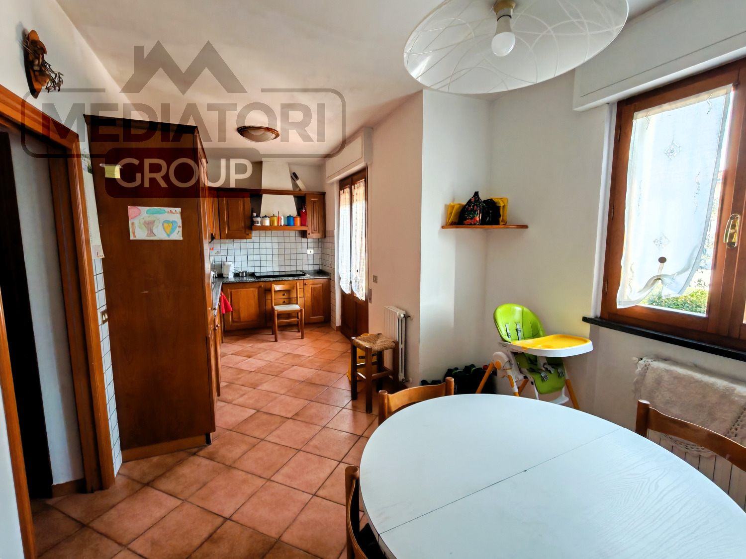 Ingresso nella zona giorno, composta da cucina abitabile con accesso diretto al terrazzo, dal quale si scende comodamente al giardino privato, ideale per momenti di relax e convivialità.